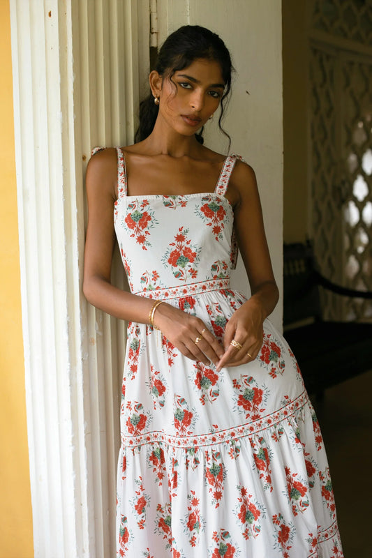 Devika Floral Midi Dress in white and Red